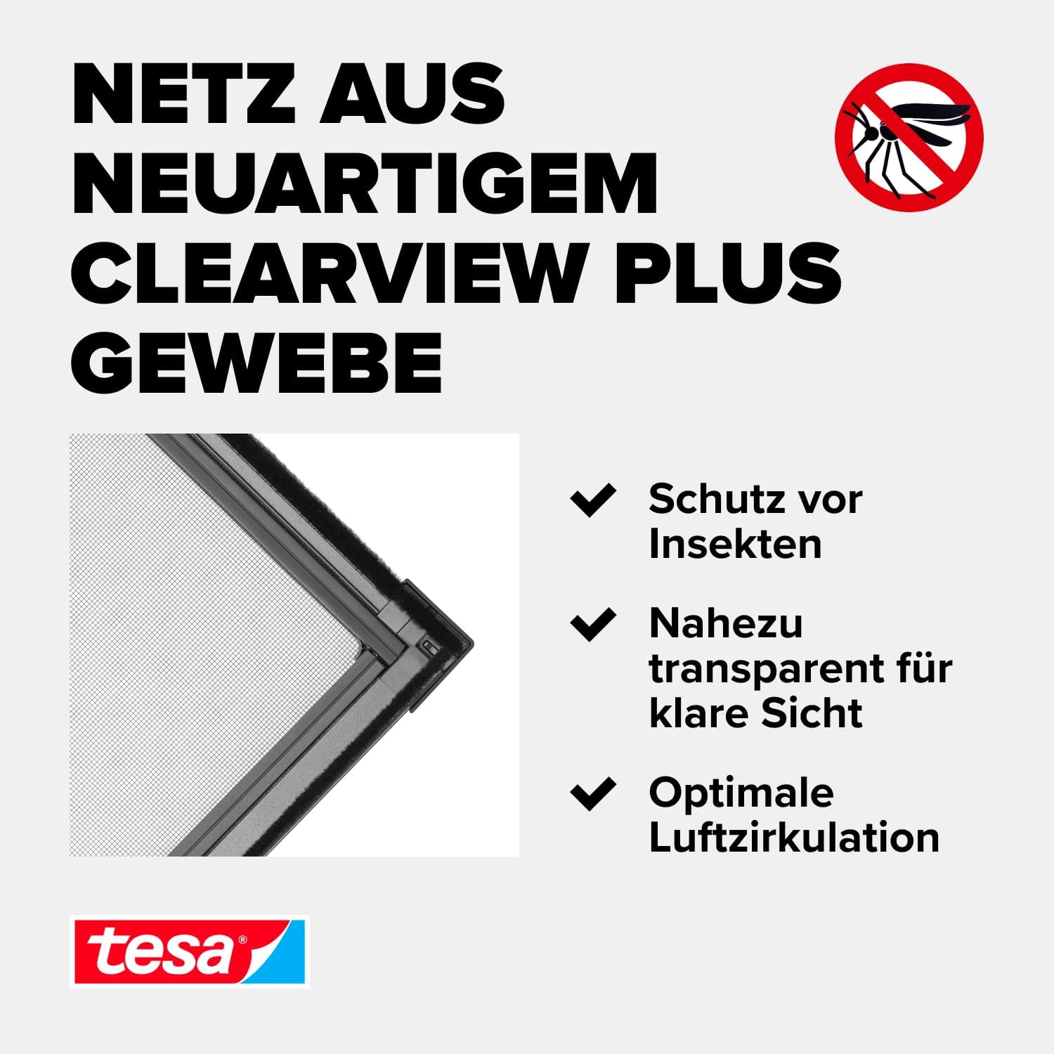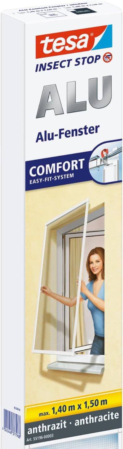 Mit dem tesa Insect Stop ALU COMFORT Fliegengitter für Fenster schützen Sie Ihre Wohnräume zuverlässig vor Mücken, Fliegen, Wespen und anderen Insekten. Das Fliegengitter in der Größe 150 × 150 cm eignet sich für viele gängige Fenster und ermöglicht angenehmes Lüften, ohne dass Insekten ins Haus gelangen. Das Fliegengitter ist mit extraflachen Aluminiumprofilen ausgestattet und bietet dadurch eine stabile und langlebige Lösung für den täglichen Einsatz. Das Clear-View-Gewebe aus Fiberglas ist licht- und luftdurchlässig und sorgt für eine verbesserte Durchsicht nach außen bei gleichzeitig zuverlässigem Insektenschutz. Die Montage erfolgt ohne Bohren und ist dadurch besonders komfortabel. Die Aluminiumprofile können individuell auf das benötigte Maß zugeschnitten und mit den patentierten Easy-Fit-Eckverbindern schnell montiert werden. Anschließend wird das Gewebe mit Kederband befestigt und der fertige Rahmen mithilfe der mitgelieferten Einhänge-Federn in den Fenster-Blendrahmen eingehängt. Dank der extraflachen Bauweise ist das Fliegengitter auch für viele Fenster mit Außenrollläden geeignet. Voraussetzung ist ein Platzbedarf von mindestens 15 mm zwischen feststehendem Fensterrahmen und Rollladen. Die Montage ist nur möglich, wenn alle vier Seiten vollständig am Fensterrahmen anliegen können. Bei Regenabweisern oder Wetterschenkeln ist eine Anbringung nicht möglich. Kann das Fliegengitter individuell angepasst werden? Wie wird das Fliegengitter montiert? Ist das Fliegengitter für Rollläden geeignet? Ist das Gewebe gut durchsichtig? Kann das Fliegengitter bei jedem Fenster montiert werden? Bestellen Sie jetzt das tesa Insect Stop ALU COMFORT Fliegengitter für Fenster in Anthrazit und genießen Sie frische Luft bei offenem Fenster – ohne Mücken, Fliegen oder andere Insekten. Maße prüfen und direkt online bestellen. Für Fragen stehen wir Ihnen gerne zur Verfügung.Fliegengitter Fenster 150 × 150 cm – Insektenschutz mit Aluminiumrahmen ohne Bohren
