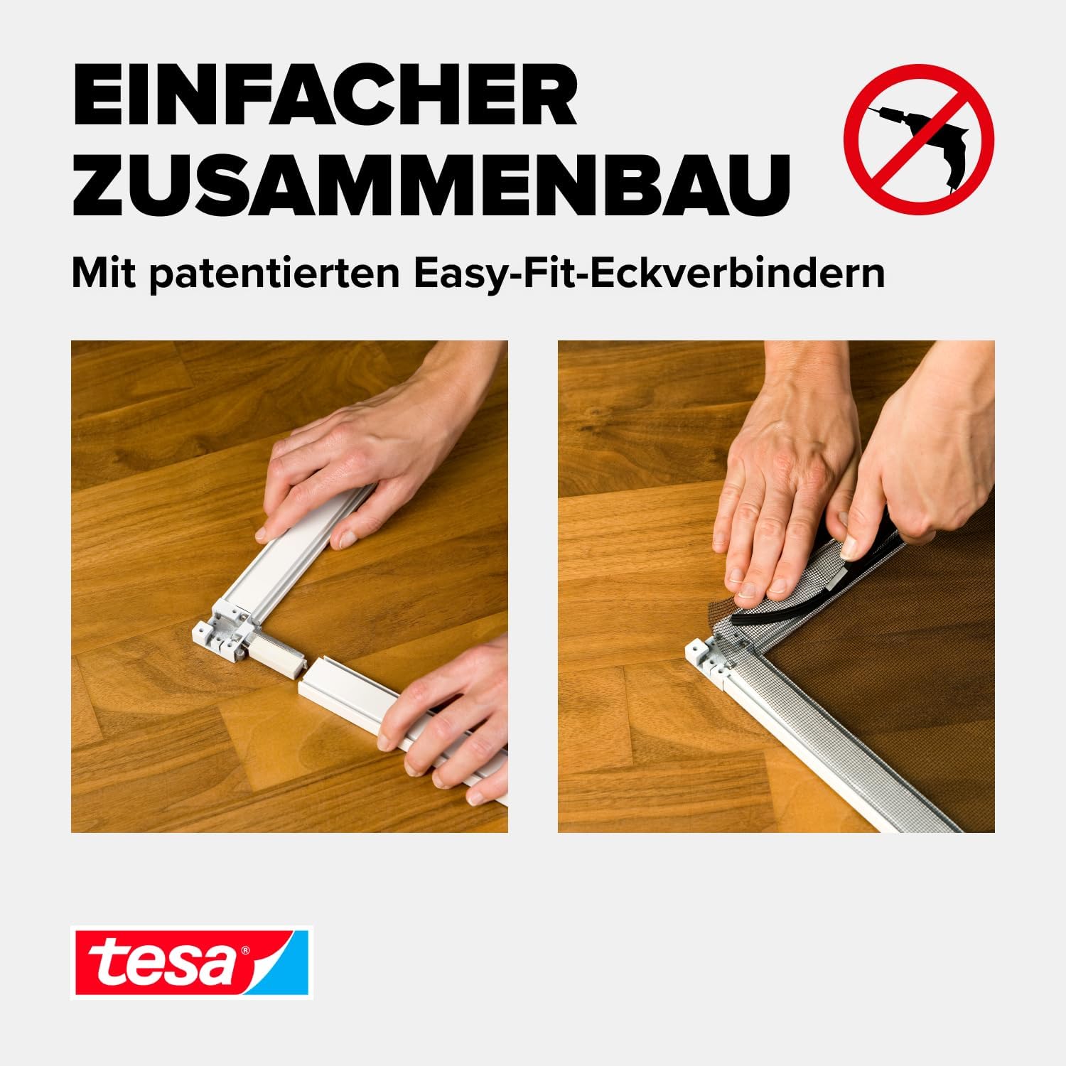 Mit dem tesa Insect Stop ALU COMFORT Fliegengitter für Fenster schützen Sie Ihre Wohnräume zuverlässig vor Mücken, Fliegen, Wespen und anderen Insekten. Das Fliegengitter in der Größe 120 × 150 cm eignet sich für viele gängige Fenster und ermöglicht angenehmes Lüften, ohne dass Insekten ins Haus gelangen. Das Fliegengitter ist mit extraflachen Aluminiumprofilen ausgestattet und bietet dadurch eine stabile und langlebige Lösung für den täglichen Einsatz. Das Clear-View-Gewebe aus Fiberglas ist licht- und luftdurchlässig und sorgt für eine verbesserte Durchsicht nach außen bei gleichzeitig zuverlässigem Insektenschutz. Die Montage erfolgt ohne Bohren und ist dadurch besonders komfortabel. Die Aluminiumprofile können individuell auf das benötigte Maß zugeschnitten und mit den patentierten Easy-Fit-Eckverbindern schnell montiert werden. Anschließend wird das Gewebe mit Kederband befestigt und der fertige Rahmen mithilfe der mitgelieferten Einhänge-Federn in den Fenster-Blendrahmen eingehängt. Dank der extraflachen Bauweise ist das Fliegengitter auch für viele Fenster mit Außenrollläden geeignet. Voraussetzung ist ein Platzbedarf von mindestens 15 mm zwischen feststehendem Fensterrahmen und Rollladen. Die Montage ist nur möglich, wenn alle vier Seiten vollständig am Fensterrahmen anliegen können. Bei Regenabweisern oder Wetterschenkeln ist eine Anbringung nicht möglich. Kann das Fliegengitter individuell angepasst werden? Wie wird das Fliegengitter montiert? Ist das Fliegengitter für Rollläden geeignet? Ist das Gewebe gut durchsichtig? Kann das Fliegengitter bei jedem Fenster montiert werden? Bestellen Sie jetzt das tesa Insect Stop ALU COMFORT Fliegengitter für Fenster in Weiß und genießen Sie frische Luft bei offenem Fenster – ohne Mücken, Fliegen oder andere Insekten. Maße prüfen und direkt online bestellen. Für Fragen stehen wir Ihnen gerne zur Verfügung.Fliegengitter Fenster 120 × 150 cm – Insektenschutz mit Aluminiumrahmen ohne Bohren