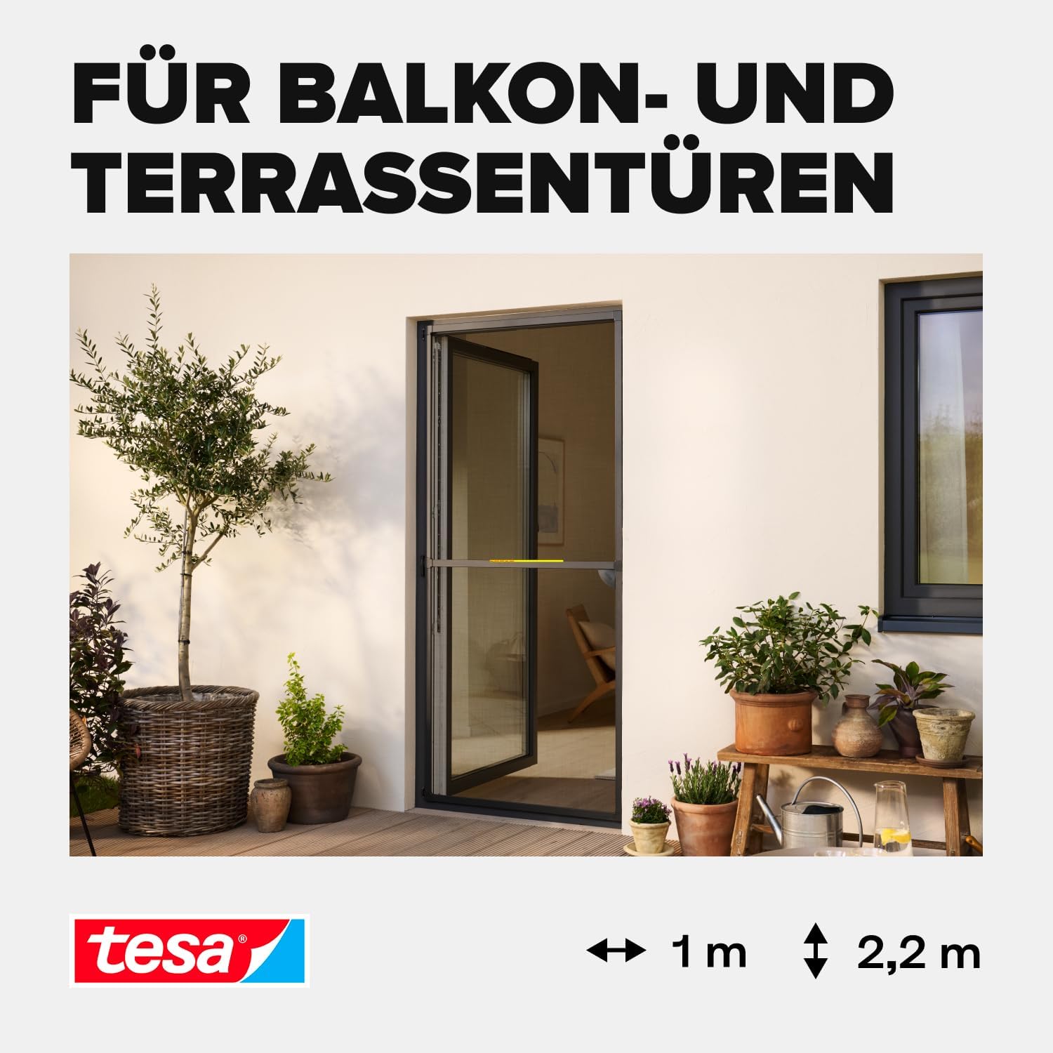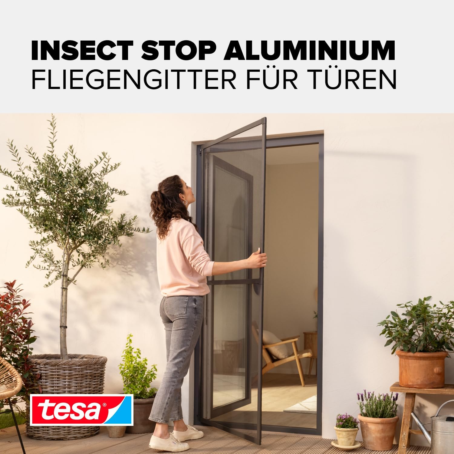 Mit dem tesa Insect Stop ALU COMFORT Fliegengitter für Türen schützen Sie Ihr Zuhause zuverlässig vor Mücken, Fliegen und anderen Insekten. Die Fliegengittertür in der Größe 100 × 220 cm eignet sich ideal für Balkon-, Terrassen- und viele Eingangstüren und sorgt dafür, dass frische Luft ins Haus gelangt, während Insekten draußen bleiben. Das Fliegengitter ist mit einem stabilen Aluminiumrahmen ausgestattet und bietet dadurch eine besonders robuste und langlebige Lösung für den täglichen Einsatz. Das Clear-View-Gewebe aus Fiberglas ist nahezu transparent, licht- und luftdurchlässig und verbessert die Sicht nach draußen bei gleichzeitig zuverlässigem Insektenschutz. Ein besonderes Highlight ist der in den Scharnieren integrierte Selbstschließmechanismus. Die Tür schließt nach dem Öffnen automatisch und erhöht so Komfort und Schutz im Alltag. Gerade bei häufig genutzten Balkon- oder Terrassentüren ist diese Funktion besonders praktisch. Der Aluminiumrahmen kann individuell auf das benötigte Maß gekürzt werden. Dank der patentierten Easy-Fit-Eckverbinder gelingt der Zusammenbau schnell und unkompliziert. Das Fliegengitter wird klassisch am Türrahmen montiert. Mit dem separat erhältlichen Comfort Adapter-Set ist in vielen Fällen auch eine Montage ohne Bohren möglich. Durch das flache Profil eignet sich die Fliegengittertür auch für viele Einbausituationen mit Außenrollladen. Voraussetzung ist ein Platzbedarf von mindestens 16 mm zwischen feststehendem Türrahmen und Rollladen. Kann die Fliegengittertür individuell angepasst werden? Wie wird die Tür montiert? Ist die Tür selbstschließend? Ist das Gewebe gut durchsichtig? Ist das Fliegengitter für Rollläden geeignet? Bestellen Sie jetzt das tesa Insect Stop ALU COMFORT Fliegengitter für Türen in Anthrazit und genießen Sie frische Luft bei offenstehender Tür – ohne Mücken, Fliegen oder andere Insekten. Maße prüfen und direkt online bestellen. Für Fragen stehen wir Ihnen gerne zur Verfügung.Fliegengitter Tür 100 × 220 cm – selbstschließender Insektenschutz mit Aluminiumrahmen