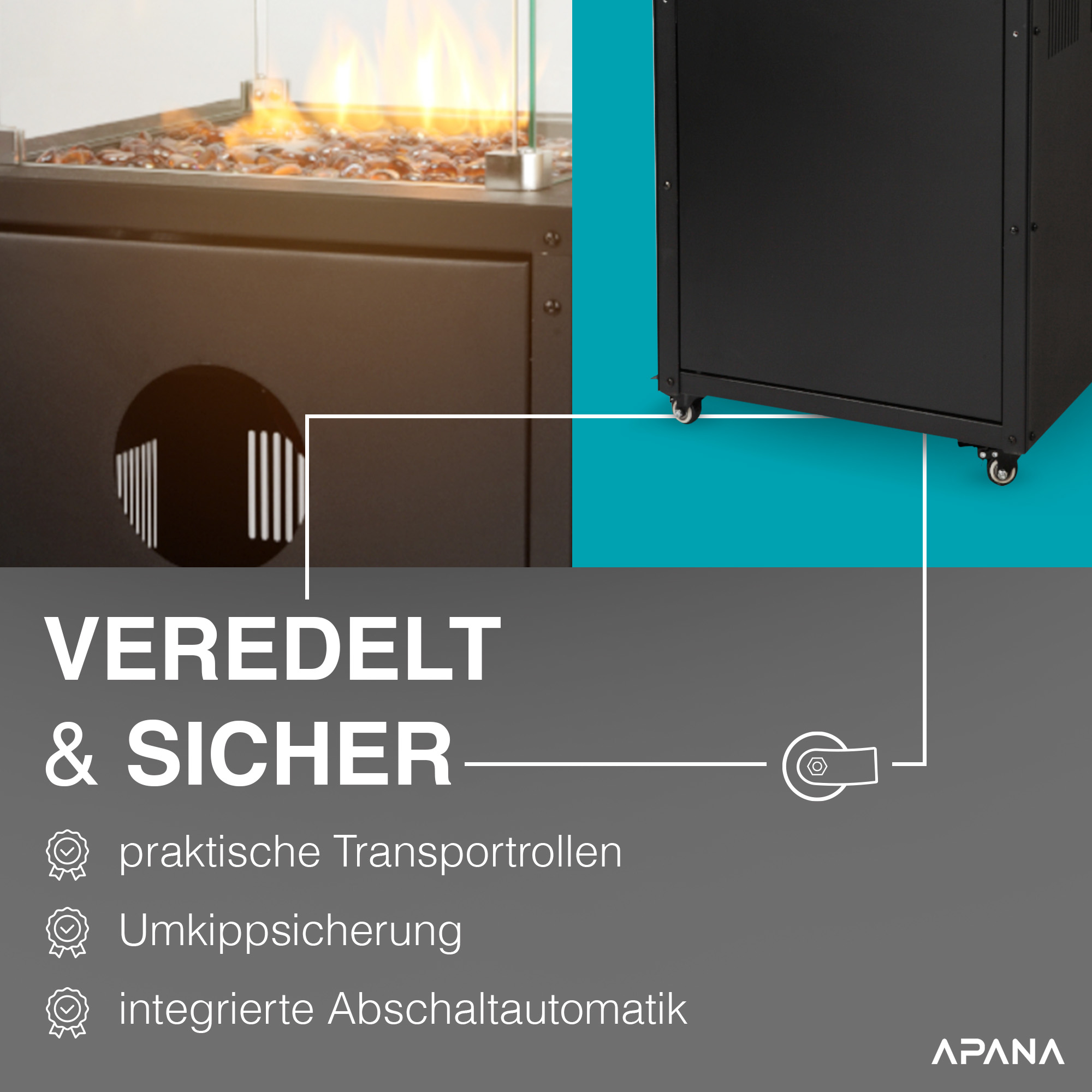 APANA Gasheizstrahler Bellamente FUEGO – stilvoller 8 kW Terrassenheizer mit Sichtfenster Der APANA Gasheizstrahler Bellamente FUEGO vereint modernes Design mit leistungsstarker Wärme. Mit seiner Heizleistung von 8 kW Das integrierte Sichtfenster aus Sicherheitsglas ermöglicht einen direkten Blick auf die Flamme und schafft ein besonderes Ambiente – sicher Mit der integrierten Piezozündung starten Sie den Heizstrahler bequem per Knopfdruck. Über die stufenlose Regelung an der Zündeinheit lässt Umkippsicherung & Abschaltautomatik für höchste Sicherheit Feststellbare Transportrollen für flexibles Verschieben Robustes Stahlgehäuse – pulverbeschichtet und witterungsbeständig Zum Lieferumfang gehört eine passgenaue Abdeckhaube, die den Heizstrahler zuverlässig vor Witterung schützt. Ebenfalls enthalten: Über die integrierte Piezozündung – einfach den Knopf drücken, Gaszufuhr regeln und Flamme genießen. Alle handelsüblichen Propan- oder Butanflaschen bis 11 kg. Ja. Durch die Umkippsicherung und automatische Abschaltung ist der Betrieb besonders sicher. Mit der mitgelieferten Abdeckhaube kann er witterungsgeschützt im Außenbereich stehen bleiben. Erleben Sie mit dem APANA Gasheizstrahler Bellamente FUEGO Wärme, Design und Sicherheit in einem Gerät. Jetzt bestellen, anschließen und stilvolle Wärme auf Terrasse oder Balkon genießen! Individuelle Beratung: Kontaktieren Sie uns telefonisch unter ???? 09822-992910 oder senden Sie uns eine Anfrage über das Kontaktformular.Design trifft Funktion – Wärme mit Stil