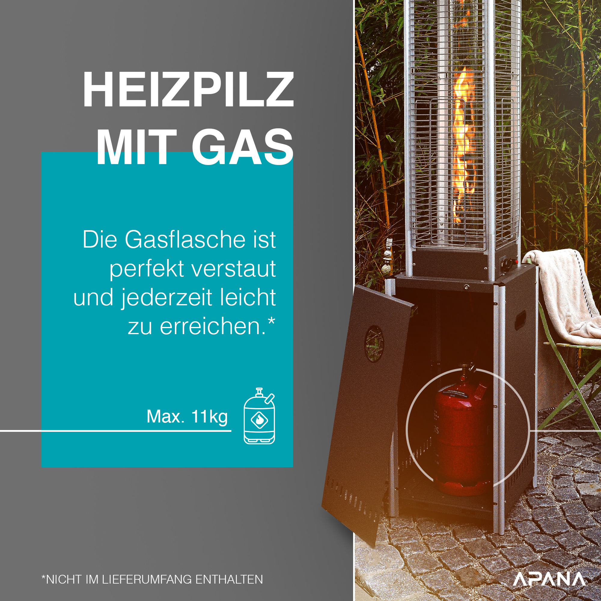 Der APANA Bellamente CRISTAL ist der perfekte Heizpilz für stilvolle Outdoor-Bereiche. Die sichtbare Flamme in der Glasröhre sorgt nicht nur für gemütliche Kraftvolle Heizleistung für Terrasse, Garten & Gastronomie Mit einer variablen Leistung von 4,5 bis 12,5 kW bietet dieser Gasheizstrahler flexible Wärmeregulierung – ganz nach Ihrem Wohlbefinden. Bereits ab einer Integrierte Umkippsicherung und Abschaltautomatik für maximale Sicherheit Piezozündung – per Knopfdruck startklar Transportrollen – mühelos verschiebbar Druckminderer inklusive – sofort einsatzbereit Pulverbeschichtetes Stahlgehäuse – robust, witterungsbeständig & modern Es eignen sich handelsübliche Propan- oder Butanflaschen bis 11 kg. Einfach über die integrierte Piezozündung – kein Feuerzeug nötig. Ja, dank seiner hohen Leistung und robusten Bauweise ist er ideal für Restaurants, Hotels und Events. Die integrierte Umkippsicherung und Abschaltautomatik stoppen die Gaszufuhr sofort bei Instabilität. Holen Sie sich den APANA Heizpilz Bellamente CRISTAL für gemütliche Stunden im Freien – leistungsstark, sicher und stilvoll. Fragen?APANA Heizpilz Bellamente CRISTAL – Exklusiver Gas-Terrassenheizer mit 12,5 kW Leistung