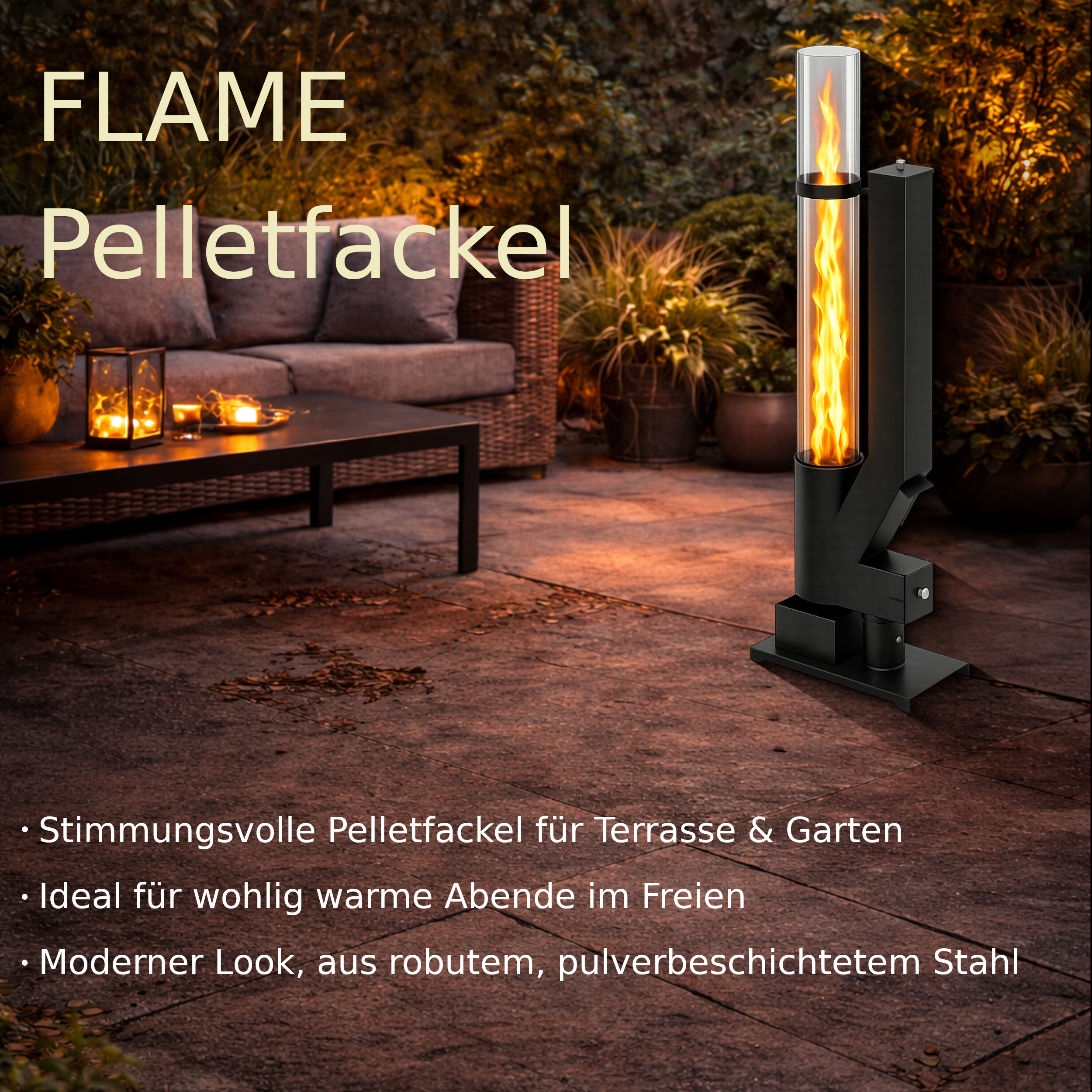Pelletfackel FLAME – Outdoor Feuerfackel für Holzpellets mit Glasröhre